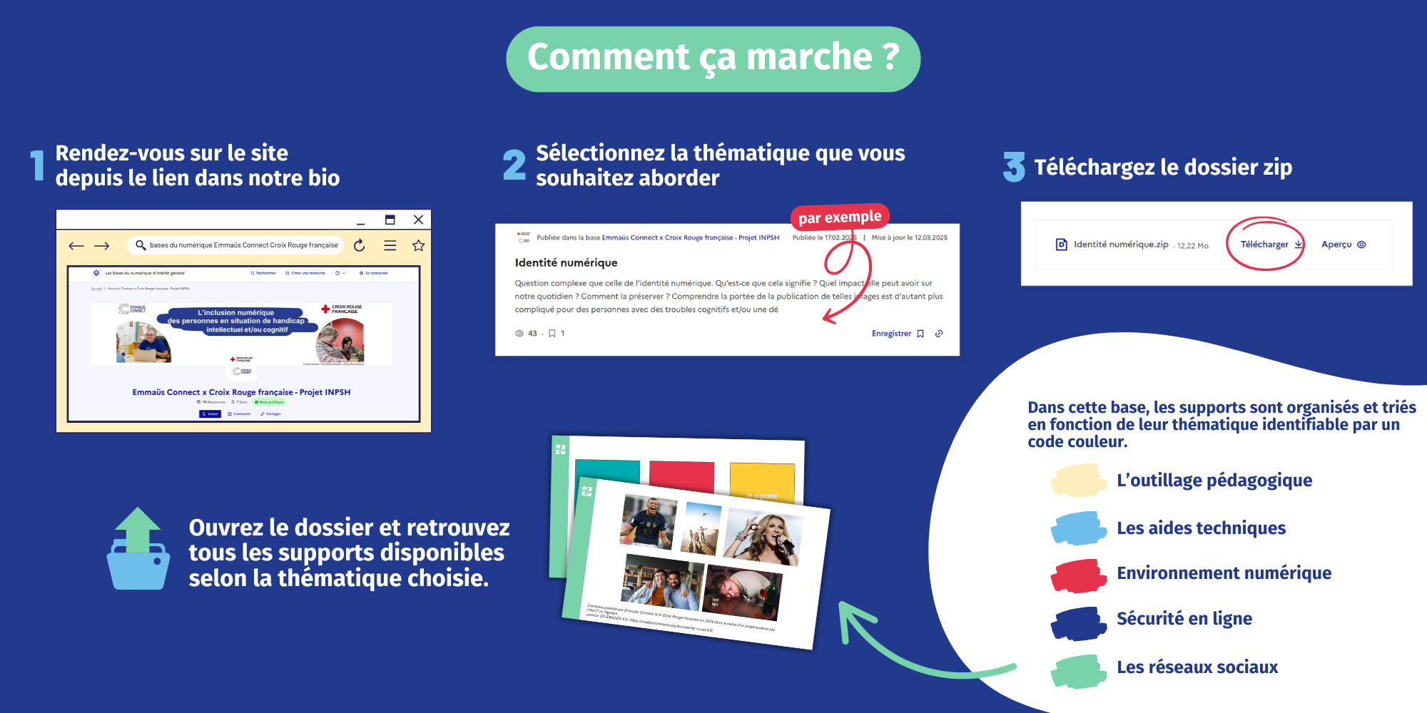 La publication de ces ressources est l’aboutissement d’un projet global d’inclusion numérique des personnes en situation de handicap, découpé en 4 phases. Après les recommandations éditées et publiées dans notre rapport (phase 1), les outils pédagogiques ont été produits (phase 2) puis expérimentés (phase 3) afin de pouvoir les proposer désormais en accès libre (phase 4).